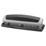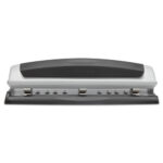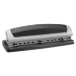 Designed for manual, precision cutting, Precision Pro® punch features patented pin technology. Adjustable centers make it easy to cleanly punch two or three holes up to its maximum sheet capacity. Easy-glide tray captures chips to help keep desktops clean. Reliable performance meets long-lasting durability. The black/silver color scheme is also stylish, with a professional appeal.