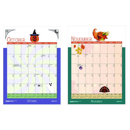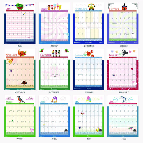 Colorful enthusiastic monthly images depicts each month’s special holiday and season with bright lively designs throughout the page. Full 12-month calendar for longer term planning. Julian dates and days remaining for quick reference. Made entirely of recycled materials.