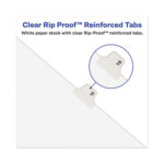 Rip Proof™ reinforced tabs printed on both sides with exhibit letter. Easy-to-read Helvetica bold type stands out. Unpunched for flexibility in binding.
