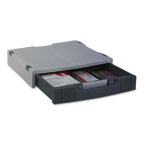 Elevated platform surface raises monitors or printers off your desktop. Buy more than one and stack. Accessory drawer with adjustable, removable drawer dividers offers extra storage for supplies. Nonskid rubber feet.