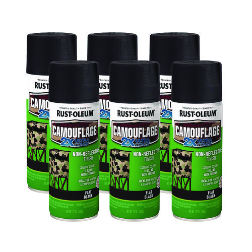 Rust-Oleum Camouflage Spray Paint provides a non-reflective, ultra flat finish for maximum hiding on interior or exterior surfaces. Fast drying camo spray paint offers quick transformation on surfaces, hunting gear, stencils and more. Camouflage Paint is ideal for sprinkler pipes, deer hunting and tree stands, outdoor wood and metal sheds, army and military-inspired vehicles, trucks and Humvees, four-wheelers, outdoor playground equipment, patio chairs, utility meters and electric boxes, fishing boats (topside only), shelves and furniture, accent walls and inside/outside structures, power tools, hunting gear and tackle boxes, paintball arenas, sports gear and scenic theatrical sets.