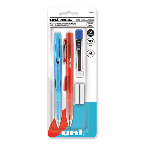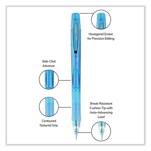 Draw, write, sketch or illustrate with CHROMA Mechanical Pencils from uni-ball. These 0.7 mm HB #2 mechanical pencils feature auto-advancing lead, so you won’t experience any interruptions as you write. A shock-absorbing cushioned point reduces lead breakage and facilitates smooth writing. Create vivid text and graphics with 0.7 mm mechanical pencils, which produce striking, dark marks. This side click mechanical pencil comes with a unique hexagonal eraser that has twelve points and edges for optimal editing prevision. Ideal for school work, art projects and note-taking, these refillable pencils have a comfort grip that reduces fatigue while helping you maintain control. CHROMA combines the most popular features requested by mechanical pencil lovers so you can enjoy cutting-edge performance with an endless flow of ideas.