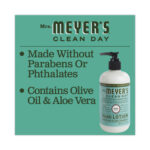 Made with thoughtfully chosen ingredients. Sweet almond oil and shea butter help to soften the driest hands. Moisturizing without being greasy or heavy feeling. Made with essential oils and plant derived ingredients. Made without parabens and phthalates, formaldehyde or artificial colors. Free of animal derived ingredients and not tested on animals. Non greasy hand lotion softens dry skin on hard working hands. Mrs. Meyer’s products are made with cruelty free formulas.