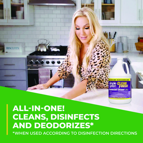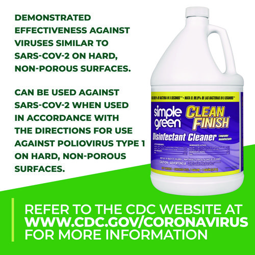 Cleans, disinfects and deodorizes when used according to disinfection directions. Use on hard non-porous surfaces. Kills 99.9% of bacteria in five seconds (Staphylococcus aureus, Klebsiella pneumoniae). Use in homes, schools, veterinary clinics, gyms, motels, kennels, daycare centers, and more. Kills cold (Rhinovirus) and flu. Simple Green Clean Finish has demonstrated effectiveness against viruses similar to SARS-CoV-2 on hard, non-porous surfaces when used as directed. Therefore, Simple Green Clean Finish can be used against SARS-CoV-2 when used in accordance with the directions for use against Poliovirus Type 1 on hard, non-porous surfaces. Refer to the CDC website for additional information.