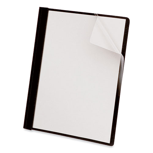 Traditional clear front report cover offers a full view of your title page. Three prong fasteners hold letter size punched sheets. Leatherette embossed paper back cover.