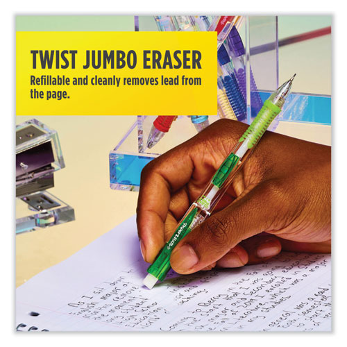 The Paper Mate Clearpoint Mechanical Pencil is a precise, fully-featured writing instrument that is ideal for standardized tests, drafting, and homework. These pencils feature a convenient side-click advance mechanism on the barrel that advances the lead with just a click. The textured over-molded grip provides comfort and control during long writing sessions, while the jumbo twist-up eraser lets you easily correct mistakes without any smudges or tearing.