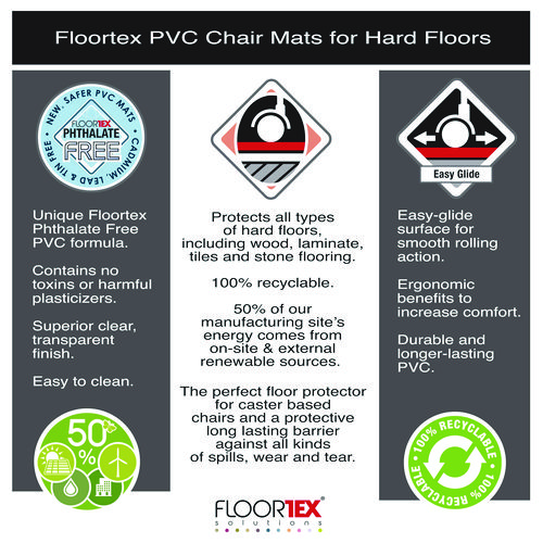 Cleartex Advantagemat chair mat provides a high quality and durable solution for floor protection and ergonomics. Protects your hard floor surfaces from office chair casters, general wear, scuffs and spills. Will not crack, chip, break or shatter under normal use and correct application. Free of phthalates, tin, lead, cadmium and BPA for peace of mind when used around children or pets. 50% of our manufacturing site’s energy comes from on-site and external renewable sources. 100% recyclable.