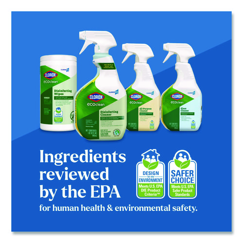 Clean with confidence—thanks to Clorox EcoClean Disinfecting Cleaner, you get the cleaning power of Clorox you expect with a Design for the Environment certified lactic acid active ingredient. This Clorox disinfecting cleaner kills 99.9% of flu viruses (Human Coronavirus, Influenza A Virus, Respiratory Syncytial Virus) and disinfects and sanitizes when used as directed. It kills SARS-CoV-2, the virus that causes COVID-19, in 30 seconds on hard, non-porous surfaces and is formulated without bleach, alcohol, phosphates, quats and dyes, leaving a clean, fresh scent. Clorox EcoClean Disinfecting Cleaner is great for everyday use, no gloves or mixing required. The product is suitable for use in commercial spaces including airports, colleges, dorms, fitness centers, hotels, long-term care facilities, offices, restrooms and waiting rooms.