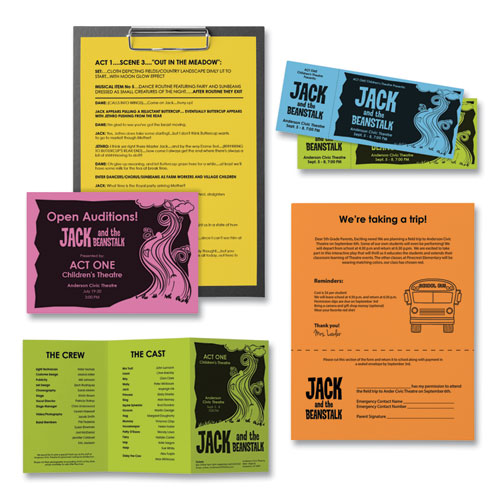 When you need to stand out with high-impact colors, Astrobrights® Colored Paper is a great choice. It’s 20% thicker and more substantial than ordinary printer paper, so you can achieve great results for one- and two-sided documents. Plus, because the colored copy paper creates a vibrant background, you’ll save on pricey full-color ink printing. Easily create vibrant fliers, brochures, school projects, signs, coupons, posters and paper crafts. Brighter colors. Brighter ideas.™ Can’t decide on just one high-impact color? With the Astrobrights® “Radiant” Assortment you don’t have to. In each pack, you’ll get five separate, solid colors. Get ready for your most creative ideas to really take off!