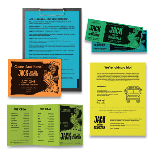 When you need to stand out with high-impact colors, Astrobrights® Colored Paper is a great choice. It’s 20% thicker and more substantial than ordinary printer paper, so you can achieve great results for one- and two-sided documents. Plus, because the colored copy paper creates a vibrant background, you’ll save on pricey full-color ink printing. Easily create vibrant fliers, brochures, school projects, signs, coupons, posters and paper crafts. Brighter colors. Brighter ideas.™ Can’t decide on just one high-impact color? With the Astrobrights® “Spectrum” Assortment you don’t have to. In each pack, you’ll get five separate, solid colors. Get ready for your most creative ideas to really take off!