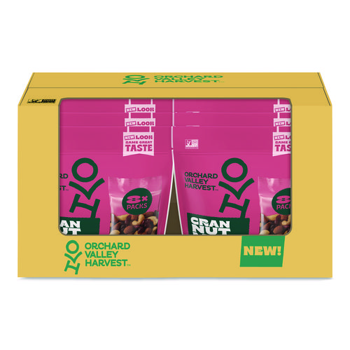 Sweet and salty combination of cranberries, almonds, and cashews! Orchard Valley Harvest makes products that are delicious and nutritious. Simply enjoy the pure, wholesome goodness with every satisfying crunch! This poly pack holds eight individually wrapped bags. The mix provides plant-based protein and is gluten free, grain free, as well as non GMO verified.