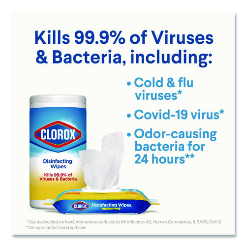 Clorox Disinfecting Wipes clean, disinfect and remove allergens leaving behind a pleasant scent. Disinfecting Wipes clean and disinfect with antibacterial power that kills 99.9% of viruses and bacteria that can live on surfaces, including COVID-19 Virus, staph, E. coli, MRSA, salmonella, strep and Kleb on hard, nonporous surfaces when used as directed. These all-purpose disposable wipes remove common allergens, germs and messes on surfaces like kitchen counters, bathroom surfaces and more. Disinfecting Wipes are safe to use on a variety of surfaces including non-food-contact surfaces in the home, office, daycares, schools, hotels, restaurants, and more. Use as directed. Allow product to air dry.