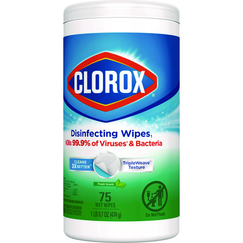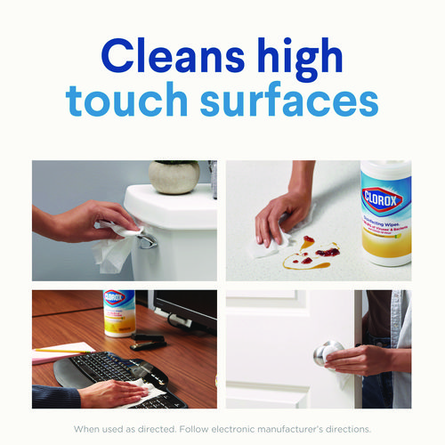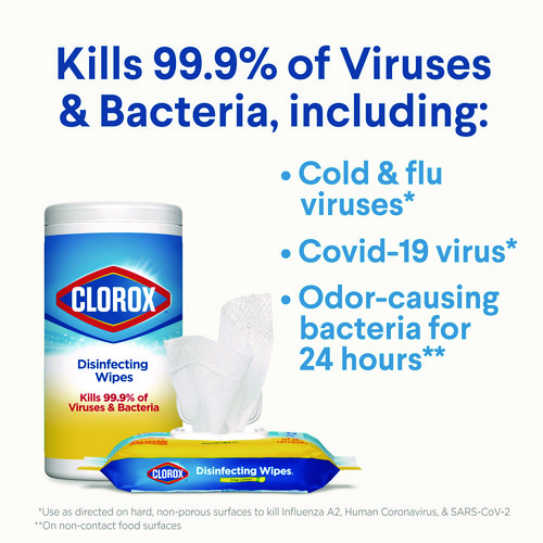 Clorox Disinfecting Wipes clean, disinfect and remove allergens leaving behind a pleasant scent. Disinfecting Wipes clean and disinfect with antibacterial power that kills 99.9% of viruses and bacteria that can live on surfaces, including COVID-19 Virus, staph, E. coli, MRSA, salmonella, strep and Kleb on hard, nonporous surfaces when used as directed. These all-purpose disposable wipes remove common allergens, germs and messes on surfaces like kitchen counters, bathroom surfaces and more. Disinfecting Wipes are safe to use on a variety of surfaces including non-food-contact surfaces in the home, office, daycares, schools, hotels, restaurants, and more. Use as directed. Allow product to air dry.