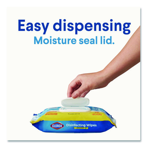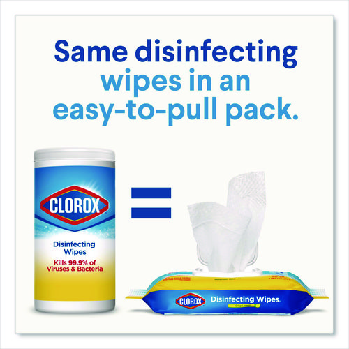Clorox Disinfecting Wipes come in a convenient easy to pull dispensing pack make cleaning easy. This flexible pack allow you to easily dispense, clean and disinfect while storing, stacking or taking on the go. 3-in-1 Clorox Disinfecting Wipes kill germs, clean tough messes and remove more than 99% of allergens, all while leaving a pleasant scent. Disinfecting Wipes kill 99.9% of viruses and bacteria that can live on surfaces, including COVID-19 Virus on hard nonporous surfaces when used as directed, staph, E. coli, MRSA, salmonella, strep and Kleb. These all-purpose wipes remove common allergens, germs and messes on kitchen counters, bathroom surfaces and more and can prevent the growth of bacteria for up to 24 hours on non-food contact surfaces. Do not flush.