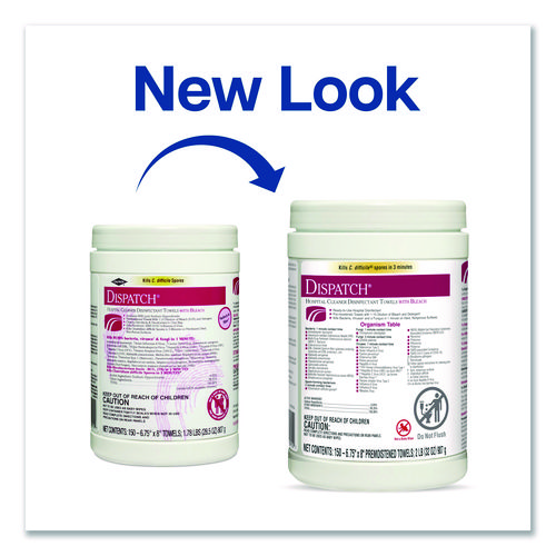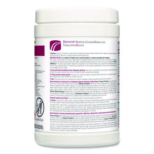 Worry less with Dispatch® Hospital Cleaner Disinfectant Towels with Bleach, designed for hospitals and recommended in cleaning and care guides for disinfecting hospital equipment. These intermediate level hospital bleach wipes kill C. difficile, MRSA, VRE and other pathogens on medical use surfaces in three minutes or less when used as directed, plus they help reduce the spread of HAIs. Dispatch® Hospital Cleaner Disinfectant Towels come with a light scent for patient and staff comfort. Recommended in cleaning and care guides for disinfecting ultrasound probes, blood glucose meters and infusion pumps. Meets CDC, CMS and OSHA guidelines for cleaning and disinfecting surfaces in healthcare facilities. A precleaning step is required to kill Clostridioides difficile and Candida auris. For unfamiliar surfaces, test in a small inconspicuous area first. Consult medical equipment warranty information and equipment care and cleaning guides prior to selecting and using any surface disinfectant.