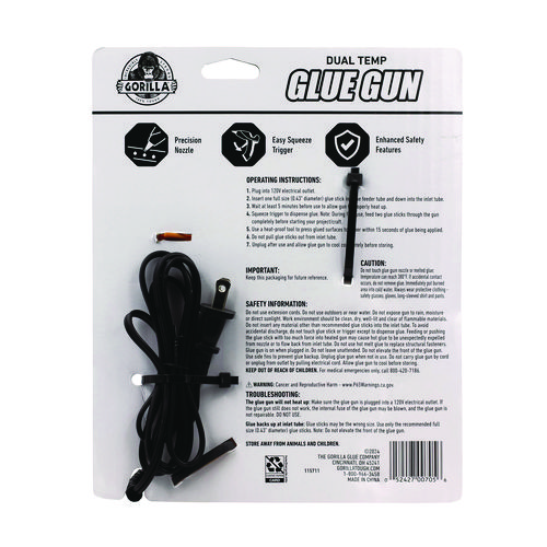 The Gorilla Dual Temp full-size glue gun is a great tool for crafts and home projects requiring more glue output and volume. The gun is lightweight, with a comfortable grip and a built-in stand making it easy to use. The easy-squeeze trigger and long insulated nozzle allow for precise application on any project.