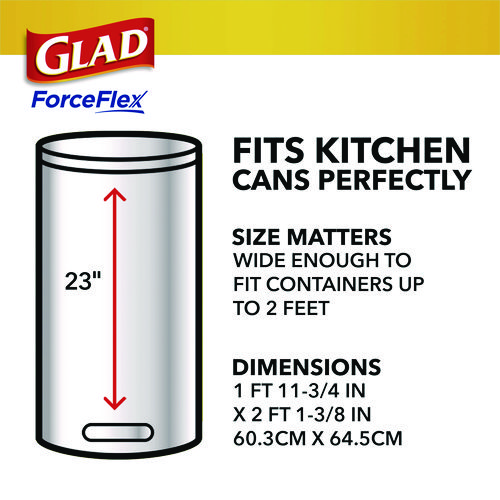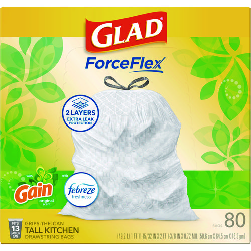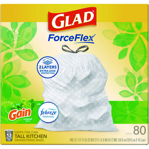 Fight nasty kitchen odors with Glad® trash bags. Glad® Kitchen Drawstring Trash Bags are designed with ForceFlex technology to give extra flex as it expands around sharp edges and heavy loads, so you can pack it in while resisting tears, rips and punctures. Keeps your kitchen smelling pleasantly fresh with long lasting odor control. Let the stretchable strength of Glad® handle all the messes our busy daily life can throw at it and then some. With double-sided seals and a reinforced bottom, these bags are designed with RipGuard® and LeakGuard® technology to prevent seepage of liquids and keep trash contained. The durable Grips-The-Can Drawstring ensures a tight grip on the trash can to keep it in place. Take the trash to the curb with no fear of leaks and tears, and no frustration. Keep your kitchen smelling clean with the stretchable strength of Glad®. Ideal for use in offices, schools, daycare centers, restaurants, hotels and other commercial facilities.