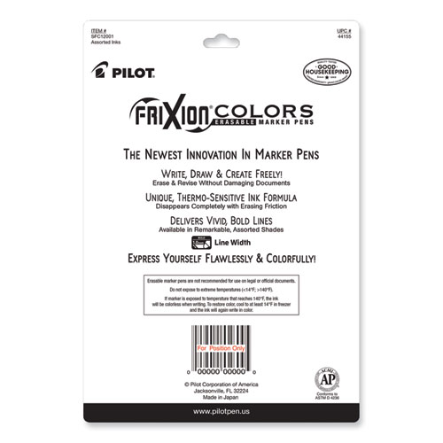 Add a touch of creativity and style to your everyday tasks with the new FriXion marker pens. Write smoothly, draw flawlessly, erase cleanly and revise repeatedly without damaging your documents, all thanks to the unique thermo-sensitive and erasable ink. The extra durable, bold point tip produces rich and vibrant lines. Quick drying ink won’t bleed through paper.