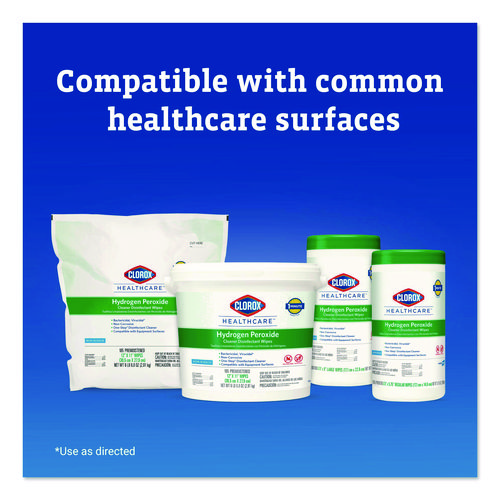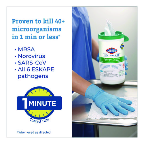 Great surface compatibility, less residue. Clorox Healthcare Hydrogen Peroxide Cleaner Disinfectant Wipes leave no harsh chemical odor or fumes and kill bacteria and viruses in 30 seconds. Disinfect with one wipe that is registered to kill C. auris, 13 antibiotic resistant pathogens and multiple strains of MRSA. This ready to use broad spectrum disinfectant has a noncorrosive formula suitable for cleaning medical devices, common areas and high touch surfaces made of materials like stainless steel, painted metals, glass, chrome, glazed tile, plexiglass and sealed fiberglass. These Clorox Healthcare hydrogen peroxide wipes are ideal for daily use in healthcare settings including hospitals, medical facilities, outpatient facilities and long term care facilities.