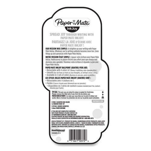 Make writing four times as fun! Paper MateĀ® InkJoy⢠Quatro Retractable Ballpoint Pens feature four bold, vivid ink colors in every pen. Just click to switch between shades and enjoy ultra-smooth ink that’s all color and no drag. The 4-in-1 design features an easy-to-hold barrel, with a comfort grip and easy-click buttons. Great for color-coding notes, these pens help you keep your thoughts organized. Switch it up with InkJoy⢠Quatro!