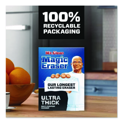 The Mr. Clean Magic Eraser Ultra Thick multi-surface cleaner lasts seven times longer than the Original Magic Eraser: no more sponges or other cleaning products needed. Just wet, squeeze, and erase over 150 messes with ease. The heavy-duty cleaning micro-scrubbers reach deep into surface grooves, lifting away built-up dirt and grime. The Magic Eraser Ultra Thick is an all-purpose cleaner that tackles tough messes all over your house, inside and out. Use it as a bathroom cleaner on soap scum, tub rings, and water spots. Use it in your kitchen on permanent marker stains, greasy counters, and grimy stovetops. Use it outdoors on grill grates and patio furniture. Also makes a great shoe cleaner and wall cleaner. Add the Magic Eraser Ultra Thick cleaner to your arsenal of cleaning supplies today.