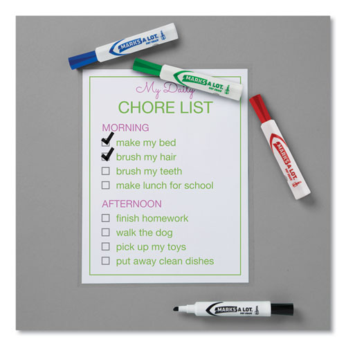 Get your thoughts across with MARKS A LOT® Desk-Style Dry Erase Markers. Their versatile chisel tips allow you to vary the width of your strokes depending on the scenario, from bold and thick to narrow and fine. Featuring wonderful color vibrancy, their ink is not only formulated to catch your audience’s attention but to erase easily and cleanly from whiteboards, glass, lamination film and other nonporous surfaces with a simple sweep of a board eraser or a dry cloth. Certified non-toxic, low-odor formula is ideal for school, work, home and more—use them virtually anywhere. You can even leave their caps off for up to 24 hours without them drying out!