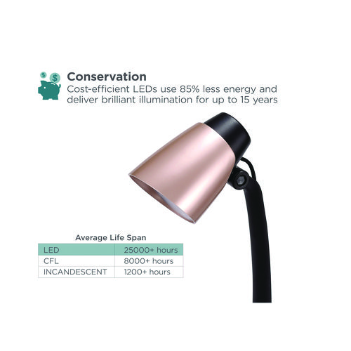 If you’re in search for a simple lamp with style, look no further than this LED Black & Decker rose gold desk lamp. With a black lamp arm and base, it takes on a classic look, perfect for an office, in a dorm or on a bedside table. The metallic rose gold lampshade brings a light pop of color, providing a modern style. This lamp mimics the look of natural daylight, perfect for those long, focused days at work. Additionally, it uses only 3.5 W of power and LEDs that last up to 50,000 hours. Reliable and easy to use, this desk lamp is too good to pass up.