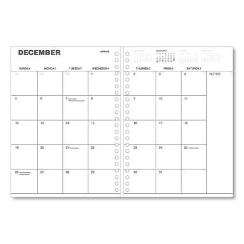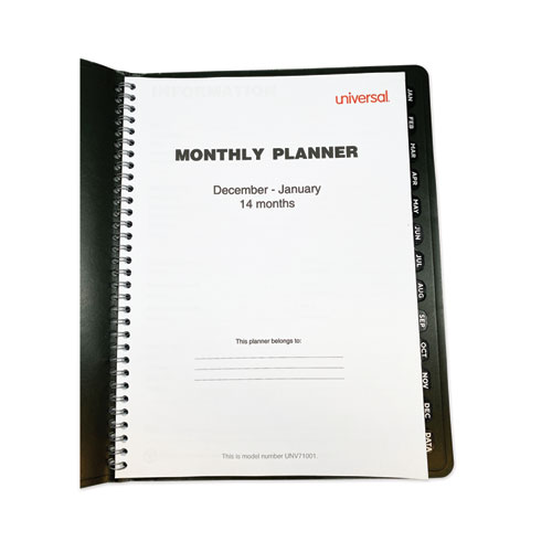 Get your schedule planned out with this Universal large 14-month monthly planner. This versatile notebook features dates to remember, three-year reference, holiday list and notes pages to help coordinate plans. Monthly planner displays one month per two-page spread with unruled daily blocks, so there’s plenty of space for writing and has a faux leather cover to provide a professional appearance.