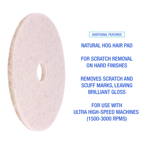 Take your floors to the next level with a natural, hog hair, burnishing floor pad that removes unsightly scratches and scuff marks from floors. Add a brilliant, glossy shine to floors that welcomes customers and gives the right impression from the start. Value pad constructed from durable fibers that require less replacement. For use with ultra, high-speed rotary machines (1,500 to 3,000 RPM).