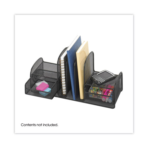 Organizer helps you effectively use desktop space. Features three vertical sections that hold file folders and binders. Two slide-out baskets hold small desktop items. Sliding shelves are ideal for small electronics or accessories. Durable steel mesh construction.