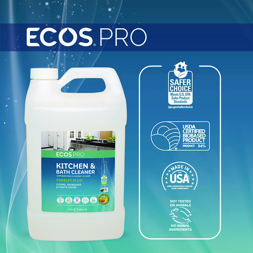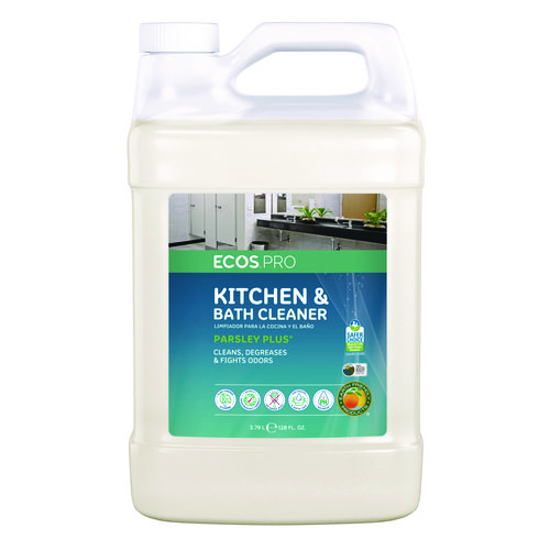 The ECOS PRO Parsley Plus all-purpose kitchen and bathroom cleaner and degreaser washes and fights odors with the natural power of parsley. This pH-balanced formula removes dirt, grease, grime, and scum from water-safe surfaces. Cleans and shines all areas of the kitchen and bathroom; works exceptionally well on granite and marble, leaving no haze or residue even on high-shine stone surfaces. Made using sustainable, plant-powered ingredients. Made without dyes; gray water and septic safe. Features a pleasant parsley scent. Not tested on animals. Manufactured in a facility that is LEED Zero Carbon, LEED Zero Waste, and LEED Zero Energy Certified.