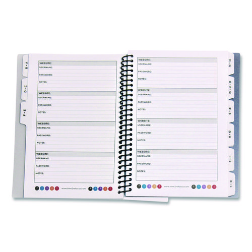 Make life easier and keep all of your password information together in one convenient location. Twelve, 1/6-cut alpha tabs help you organize your various accounts, so you can flip directly to the entry you need. A standardized entry format provides boxes for the website address, date and your user-name as well as plenty of space for your password, security questions and any additional contact information you might have for the associated organization. Sturdy, bend-, tear- and scratch-resistant cover along with premium paper stock helps ensure your important information is kept neat and clean.