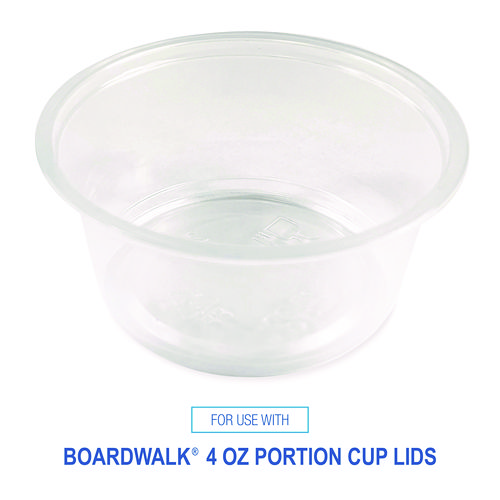 The perfect, small size, portion control cup that’s ideal for dressings, sauces, sides, and toppings. These sturdy, high-quality cups are great for samples, condiments, and smaller food items. The substantial lip snugly fits with a Boardwalk® lid (sold separately) to keep liquid or solid contents inside when packing meals to-go. High-quality polypropylene design provides great strength and stability, allowing for convenient stacking and storage.