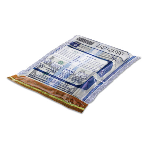 High visibility void message reveals tampering attempts. Patented triple-seal closure with interior adhesive leaves no openings once sealed. Special thermochromic ink turns red when subjected to heat. Security micro perforation immediately reveals attempts to pull closure up. Anti-static liner does not cling to hands and clothes, speeding up processing. Aqua detect ink reveals exposure to fluid. Large serial numbers and barcodes for easy tracking via CCTV. Indented side welds preventing cut and resealing. 1,000 note capacity.
