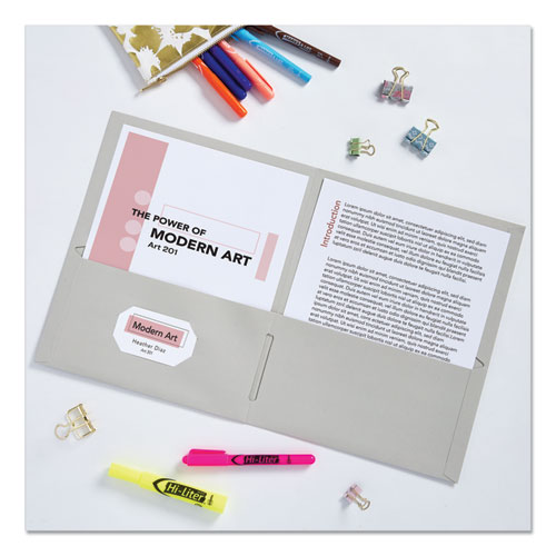 Keep your documents organized with Avery Two Pocket Folders. The textured paper 8″ x 11.5″ document folder features two internal pockets designed to hold a variety documents. Use the folders to create school folders for the upcoming next semester, presentation folders for a trade show, office folders to hold important project documents, and more. Load and unload documents at ease as each pocket corner includes built-in open side notches designed for easier access to your pages. These paper folders also allow you to write on or add a label to its cover. Holds up to 40 sheets of paper (20 per pocket).