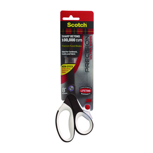 Scotch Precision Ultra Edge Titanium Scissors come with the high quality titanium-fused blades for a sharp edge beyond 100,000 cuts. Professional quality you expect from Scotch Brand. Non-stick coating on blades resists sticky build up to save you time cleaning blades. Ideal for use with crafts, fabrics, cardstock and photos. If needed, use a damp cloth to clean adhesives from blades. Soft comfort grip handle is ideal for left or right-handed use to help keep creativity going. Keep them handy for everyday cutting needs.