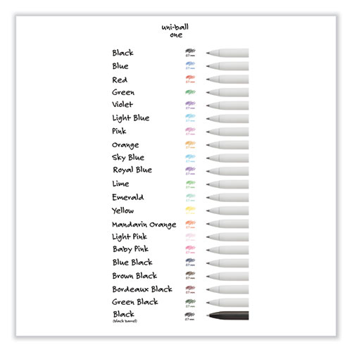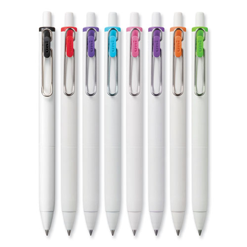 Experience the next stage of ink technology innovation with uniONE Retractable Gel Pens. The revolutionary gel ink is specially formulated with large pigments that do not absorb into the paper. This results in writing and drawing that is darker, brighter and ultra vivid. Quick drying gel pens resist smudging, smearing and bleeding, making them ideal for crisp and easy to read notes and assignments. A 0.7 mm medium tip strikes the perfect balance between bold and detailed lines. The sleek white barrel with integrated anti-slip grip makes this pen a stylish writing tool. Additionally, the functional wire clip indicates the gel ink color, as well as opens wide for easy attachment to papers, notebooks or folders. uni-ball® uniONE gel ink delivers superior writing performance whether at school, at home or at work.