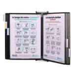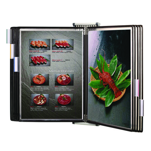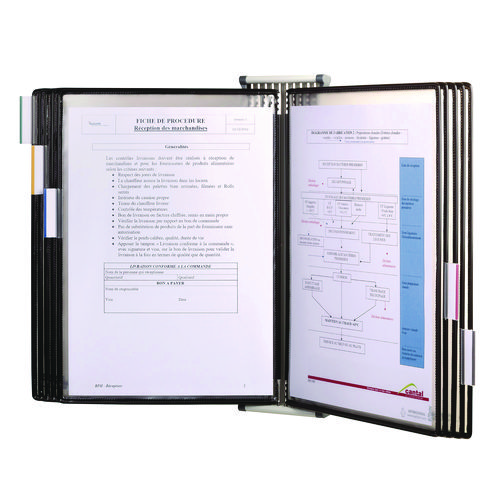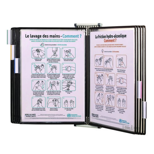Wall-mount reference unit with 10 black-frame antimicrobial letter-size pockets designed for working environments subject to strict hygiene standards where multiple users have/need access to important documents. On documents handled by numerous users, microbes, germs and bacteria can reproduce, transmit, and possibly cause contagious diseases. The silver ions embedded in the antimicrobial display pockets deter microbial growth by eliminating micro-organisms presenting a health risk. Stops germs and bacteria in under two hours.