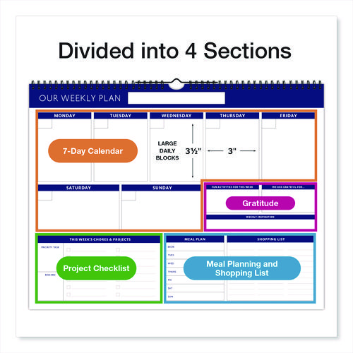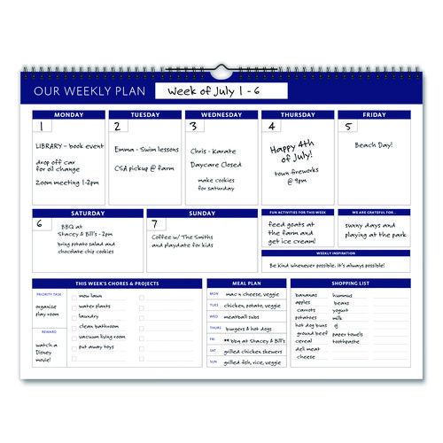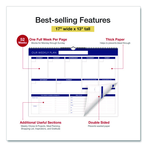 Keep your family organized and never miss an important event again. This undated Weekly Family Planner provides the flexibility you need to handle even the most hectic family scheduling and planning challenges. Each week’s intuitive layout delivers open-format blocks for each day’s appointments, events and activities, while providing handy formatted blocks and checklists for the week’s chores, projects, priority tasks, rewards/incentives, meal plans, shopping lists and more. Flexibility doesn’t end with its layout, either. Its unique design allows you to use it as a book, a wall-planner or a countertop pad.